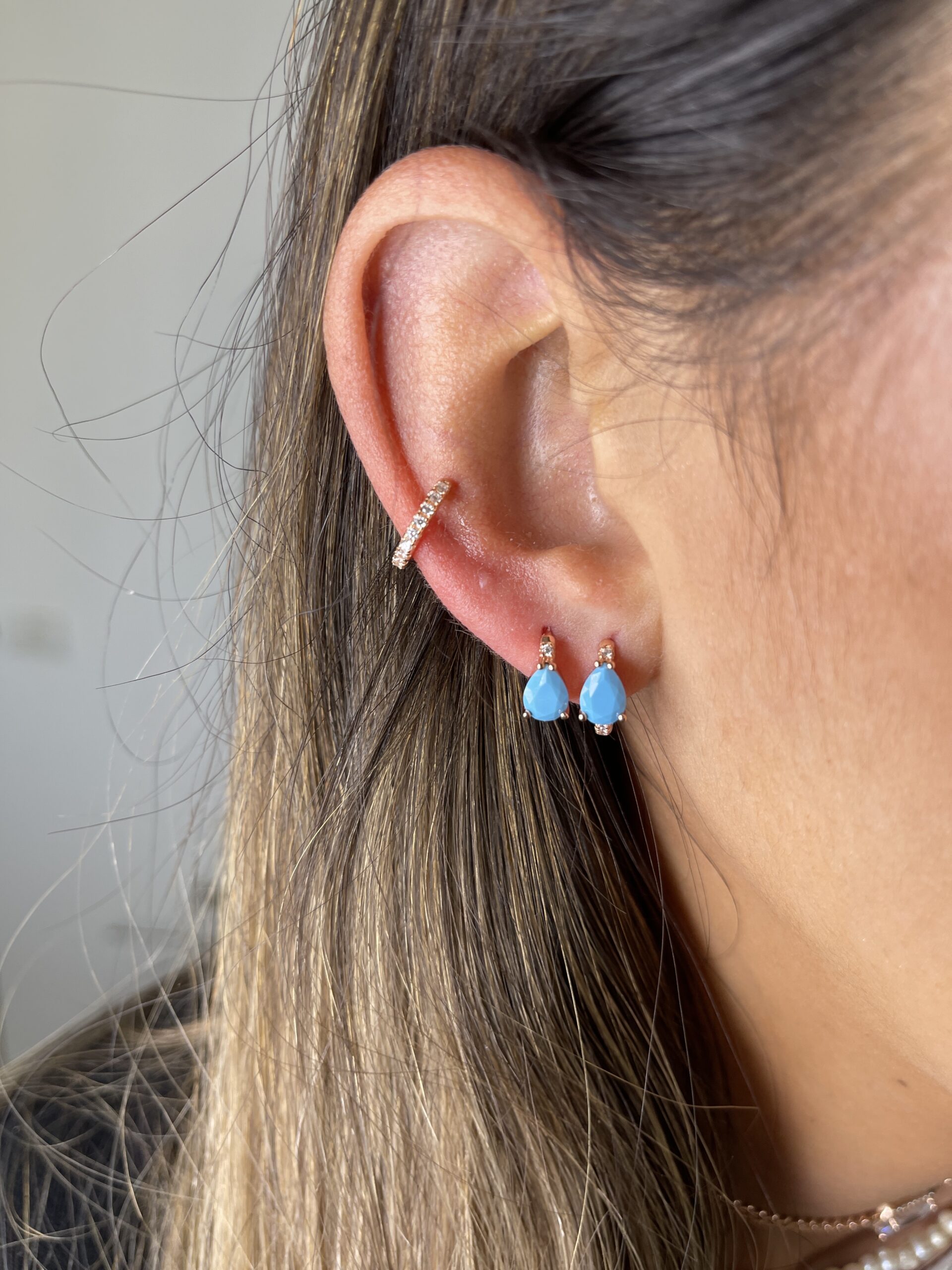 עגילי חישוק עם זרקון טיפה טורקיז, מכסף טהור 925 בציפוי רוז גולד, משובץ זרקונים.