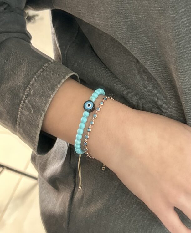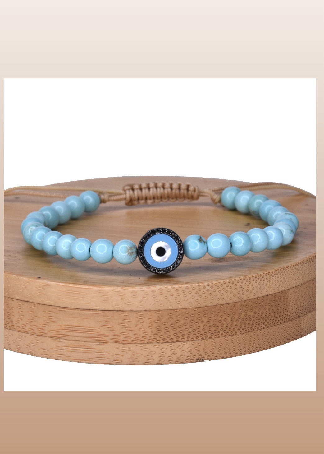 צמיד חרוזים טורקיז עם עין שחורה מכסף טהור 925, משובץ זרקונים.