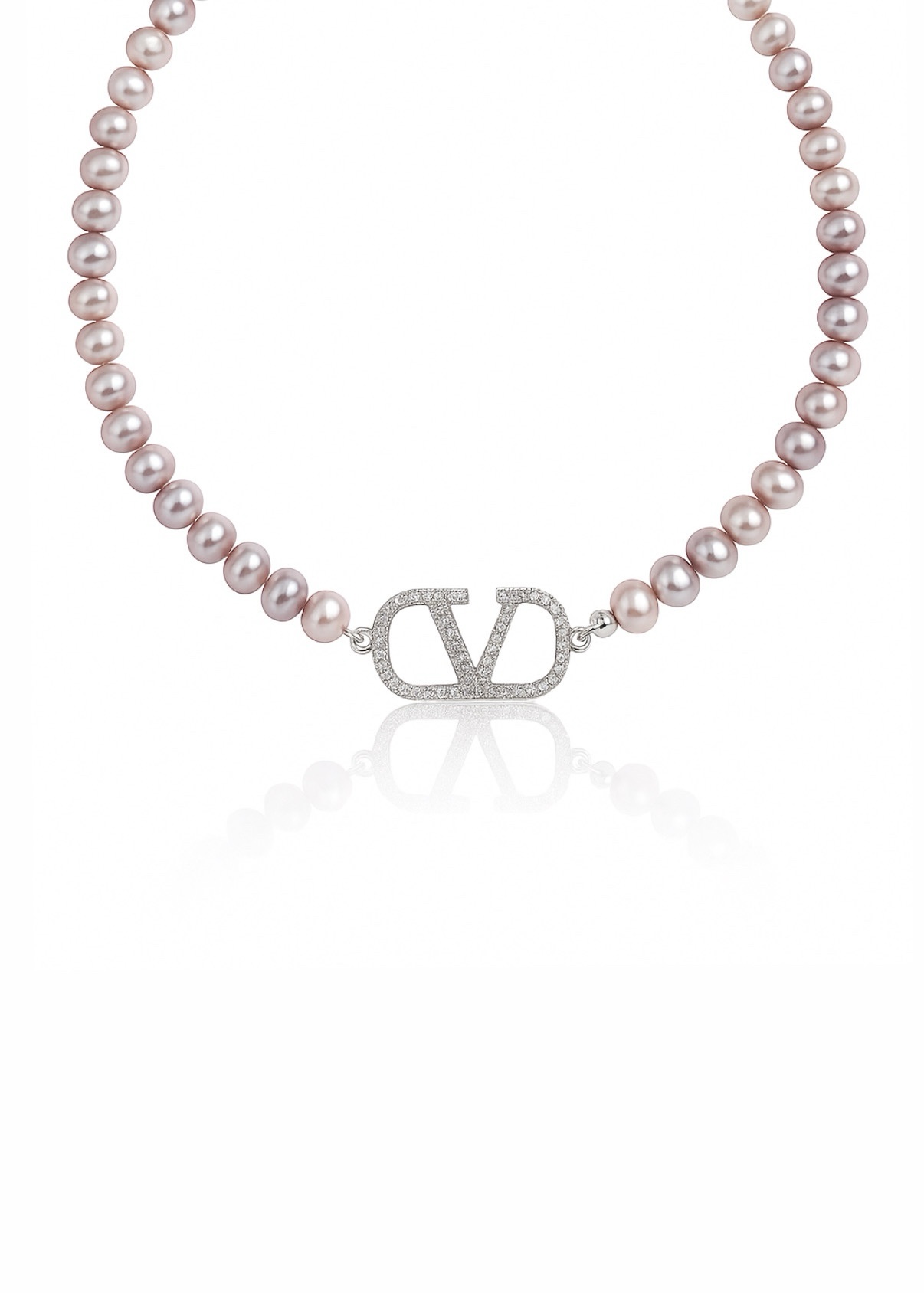 שרשרת פנינים מתורבתות בצבע סגלגל. בשילוב V משובץ מכסף טהור 925, שיבוץ זרקונים