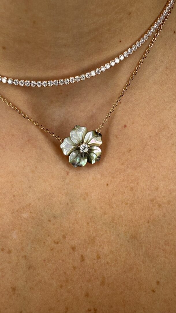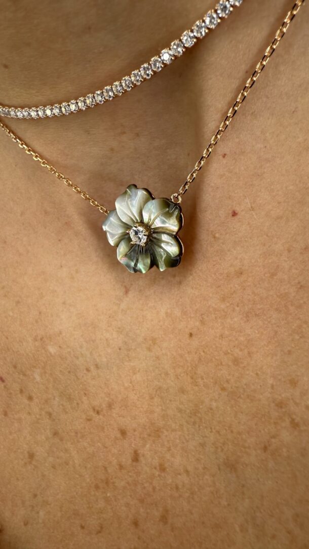 שרשרת פרח פנינה אמיתית מכסף טהור 925 בציפוי רוז גולד, משובצת זרקון באמצע.