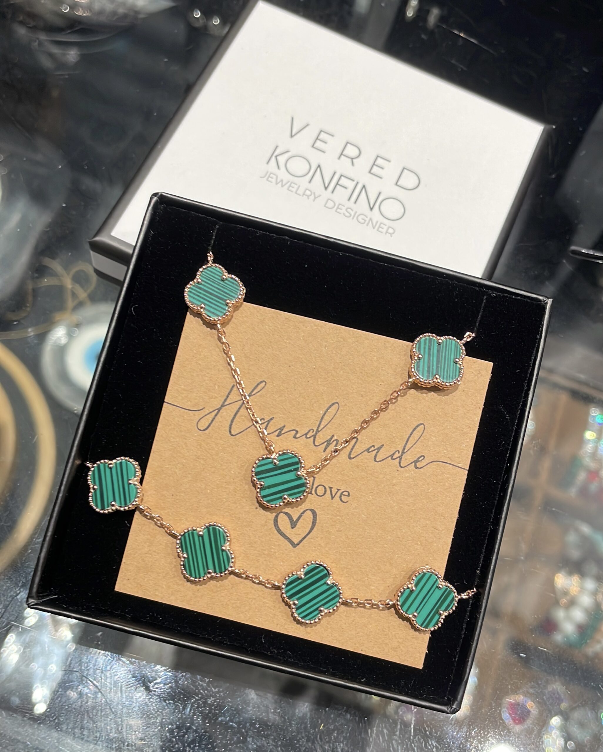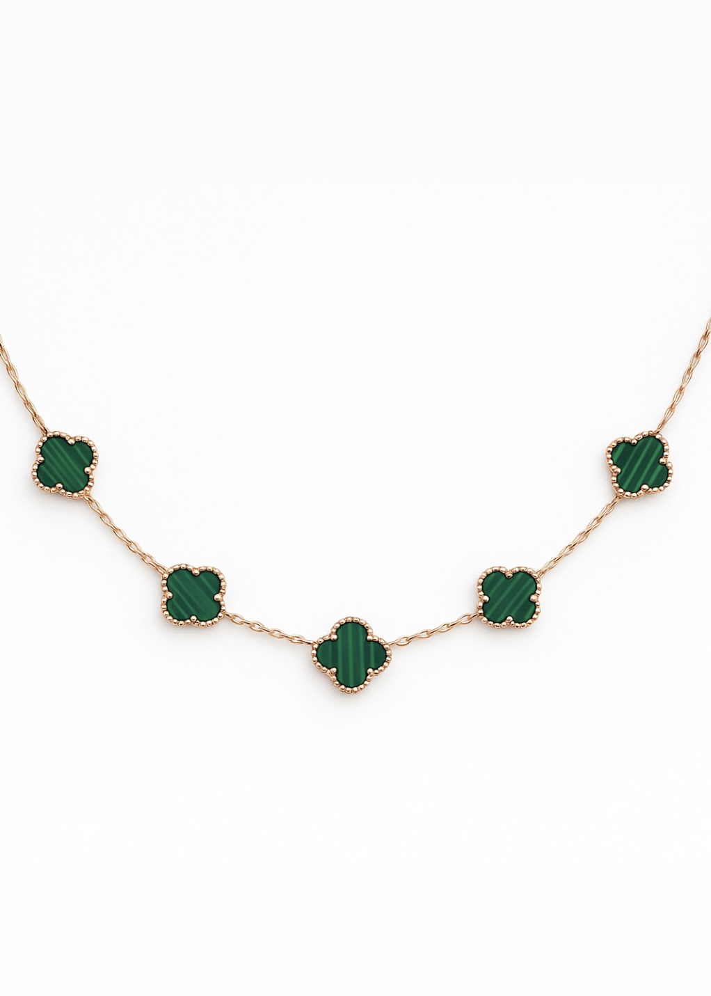 שרשרת 5 תלתנים ירוק מלכית מכסף טהור 925 בציפוי רוז גולד, משובצת זרקונים .