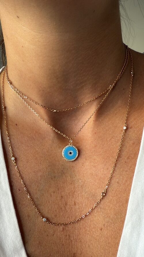 שרשרת עין עגולה טורקיז מכסף טהור 925 בציפוי רוז גולד, משובצת זרקונים .